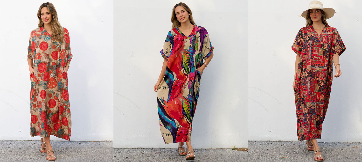 Quick answers to questions about the size and fabric of the caftans and delivery.